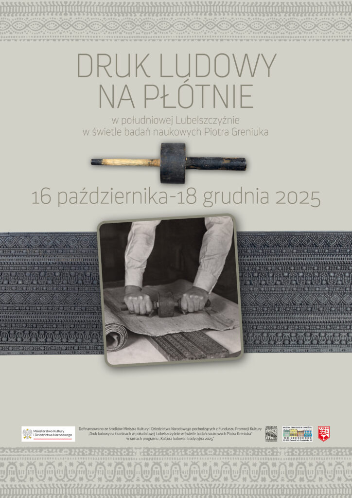 Wystawa jest realizowana w ramach zadania „Druk ludowy na tkaninach w południowej Lubelszczyźnie w świetle badań naukowych Piotra Greniuka”, program „Kultura ludowa i tradycyjna 2025”, dofinansowanego ze środków Ministra Kultury i Dziedzictwa Narodowego pochodzących z Funduszu Promocji Kultury.