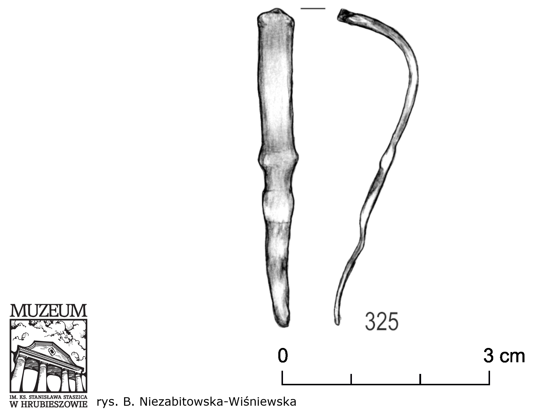 Niezabitowska-Wiśniewska B. 2021, Młodszy okres przedrzymski, rzymski i wędrówek ludów – materiały do dziejów Kotliny Hrubieszowskiej / Late pre-Roman, Roman and Migration periods – materials for the history of the Hrubieszów Basin, in: B. Niezabitowska-Wiśniewska, A. Hyrchała, B. Bartecki (eds.) Odkryte. Odzyskane. Ocalone. Kolekcja zabytków z młodszego okresu przedrzymskiego, okresu rzymskiego i wędrówek ludów ze zbiorów Muzeum im. ks. Stanisława Staszica w Hrubieszowie / Unearthed. Recovered. Saved. A collection of late pre-Roman, Roman and Migration period artefacts from the Rev. Stanisław Staszic Museum in Hrubieszów, Hrubieszów, 132–133, 221, 248, tabl. XXX:325.