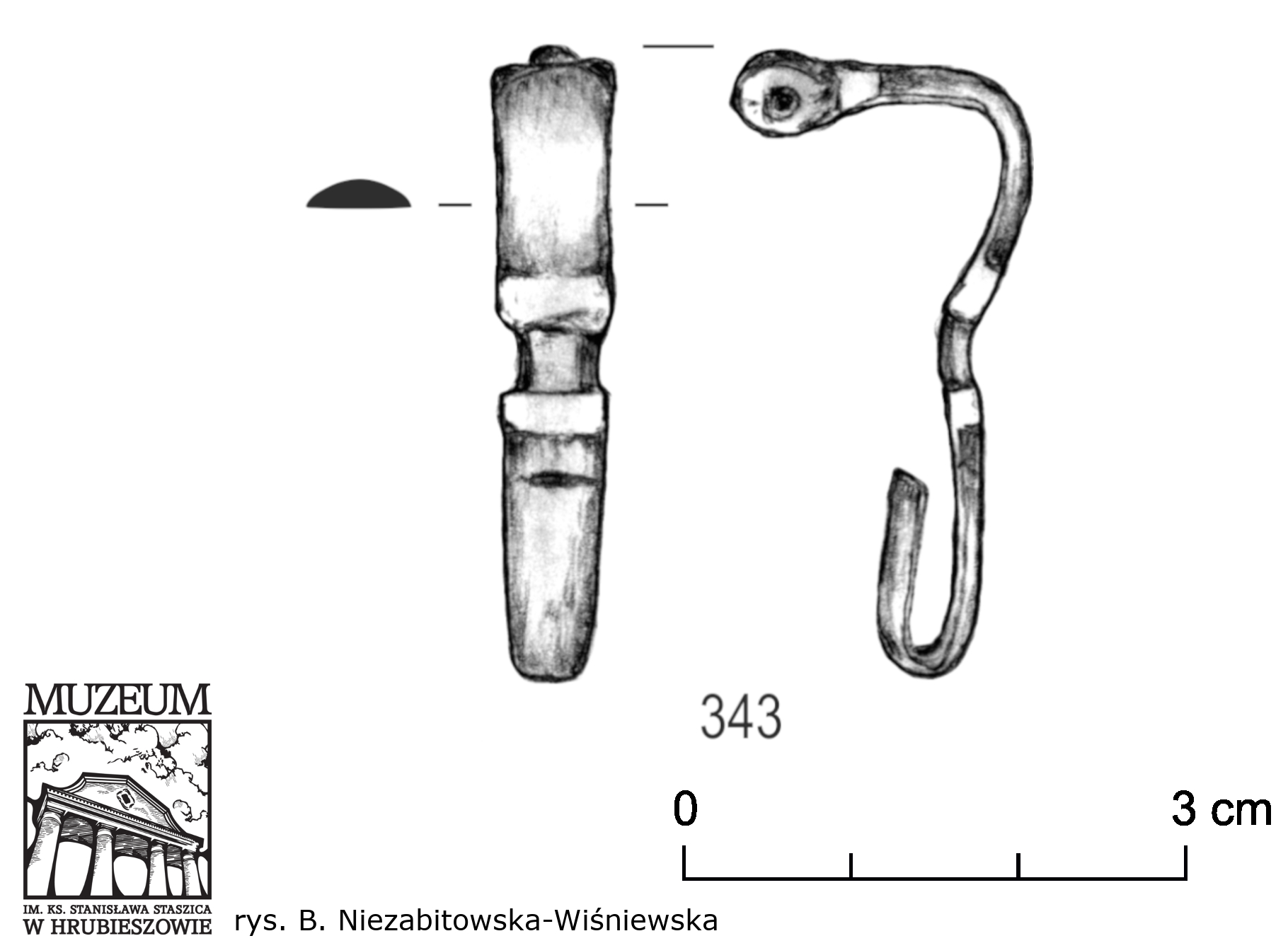 Niezabitowska-Wiśniewska B. 2021, Młodszy okres przedrzymski, rzymski i wędrówek ludów – materiały do dziejów Kotliny Hrubieszowskiej / Late pre-Roman, Roman and Migration periods – materials for the history of the Hrubieszów Basin, in: B. Niezabitowska-Wiśniewska, A. Hyrchała, B. Bartecki (eds.) Odkryte. Odzyskane. Ocalone. Kolekcja zabytków z młodszego okresu przedrzymskiego, okresu rzymskiego i wędrówek ludów ze zbiorów Muzeum im. ks. Stanisława Staszica w Hrubieszowie / Unearthed. Recovered. Saved. A collection of late pre-Roman, Roman and Migration period artefacts from the Rev. Stanisław Staszic Museum in Hrubieszów, Hrubieszów, 140–141, 221, 248, tabl. XXXI:343.